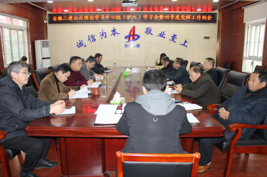 12月11日下午,安徽二建公司召開(kāi)黨委理論學(xué)習(xí)中心組(擴(kuò)大)暨四季度黨群工作會(huì),公司領(lǐng)導(dǎo)班子、黨委工作部、紀(jì)檢監(jiān)察室、工會(huì)、團(tuán)委、信訪保衛(wèi)部、人力資源部主要負(fù)責(zé)人,所屬各黨支部書記參加。會(huì)議由黨委副書記、紀(jì)委書記仇多維主持。